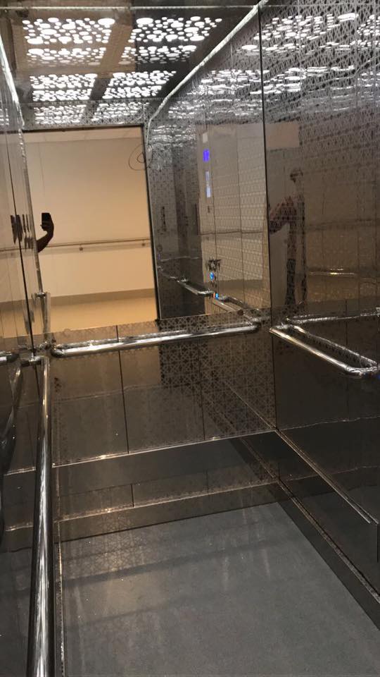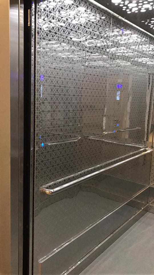 The lift cabins are finish in an exciting patterned stainless and equally stunning ceiling design with LED lamps.